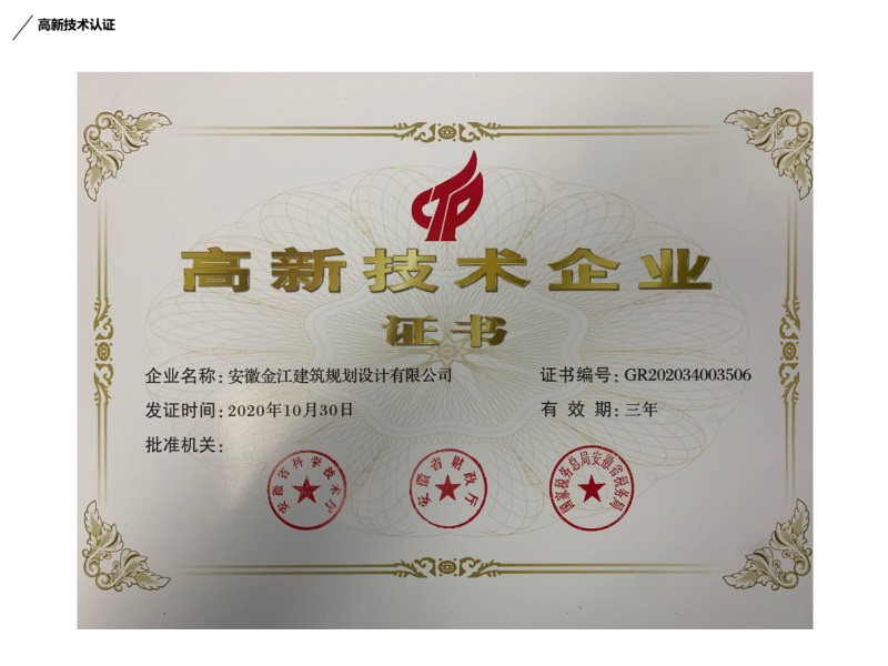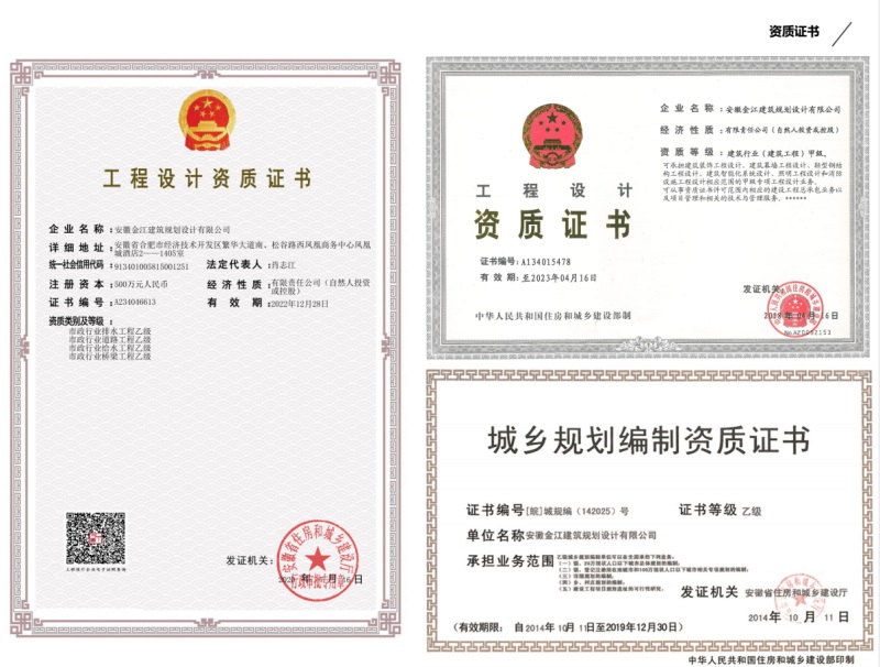 公司具有市政行业排水工程乙级、市政行业道路工程乙级、市政行业给水工程乙级、市政行业桥梁工程乙级、建筑行业(建筑工程)甲级、城乡规划编制资质乙级、高新技术企业、质量管理认证等多项证书及专利。业务涉及建筑设计、景观设计、城市规划、室内设计、市政设计等多个领域,并在住宅小区、办公产业园、教育建筑等方面积累形成了专业优势。金江设计在业内卓越的表现,赢得了国企的认可,现已被某国企看中收购。