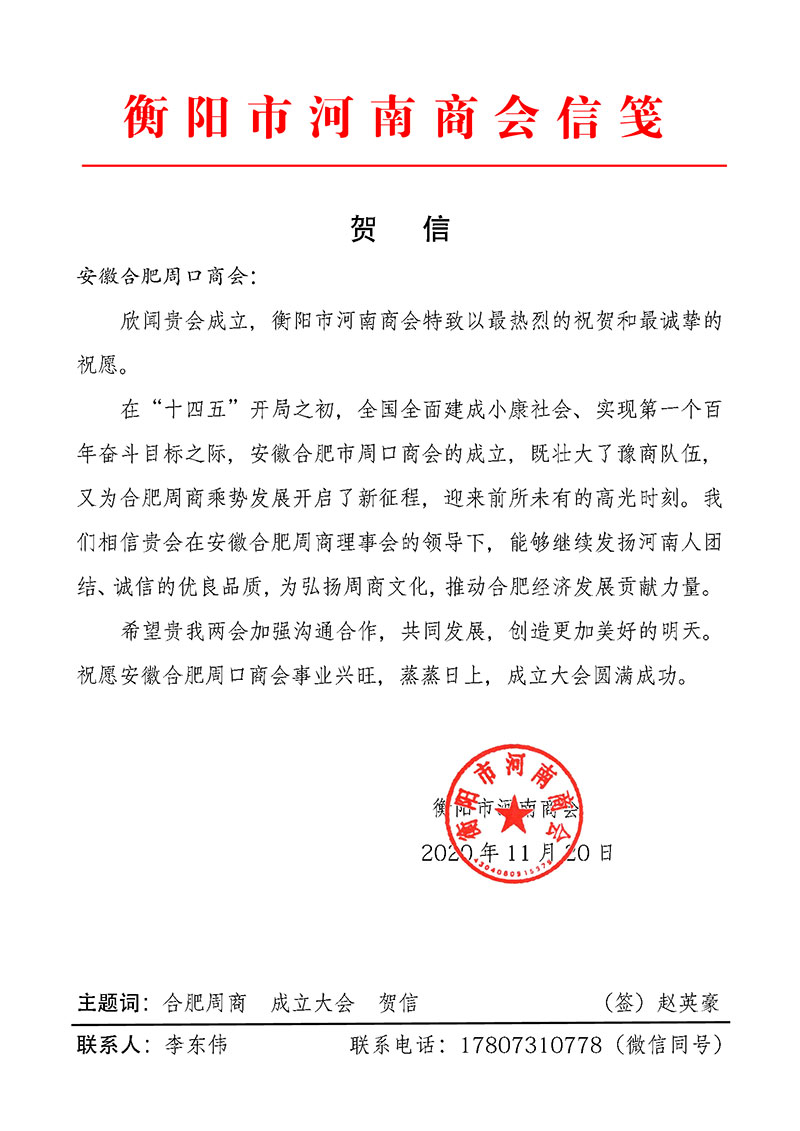 衡阳市河南商会对合肥市周口商会成立大会的贺信