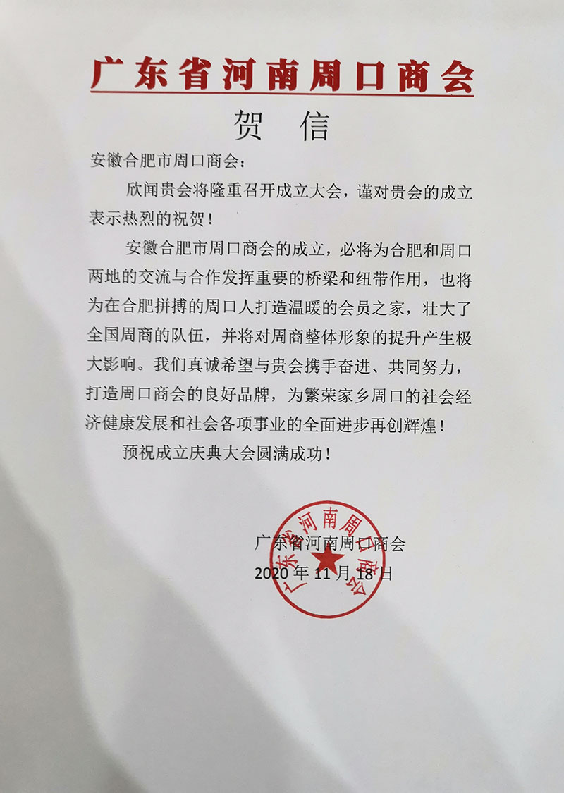 广东省周口商会对合肥市周口商会成立大会的贺信