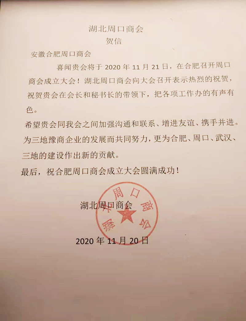 湖北周口商会对合肥市周口商会成立大会的贺信