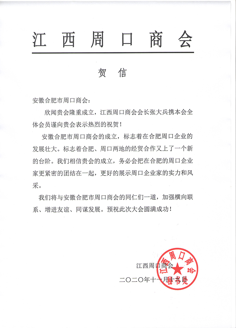 江西周口商会对合肥市周口商会成立大会的贺信