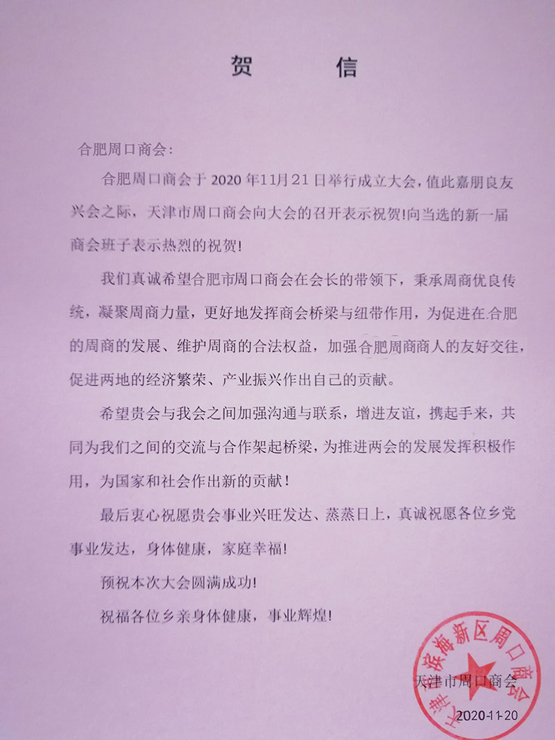 天津滨海新区周口商会对合肥市周口商会成立大会的贺信