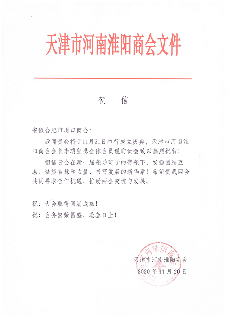 天津市河南淮阳商会对合肥市周口商会成立大会的贺信