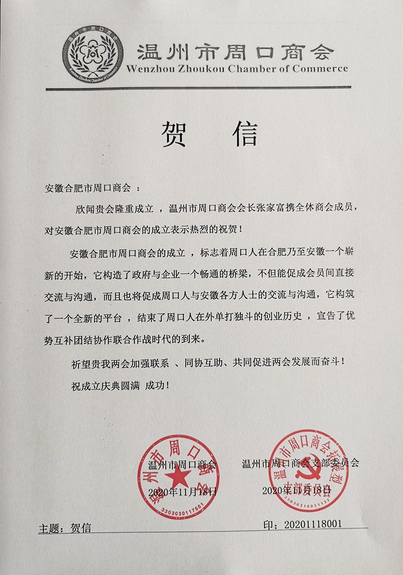 温州市周口商会对合肥市周口商会成立大会的贺信