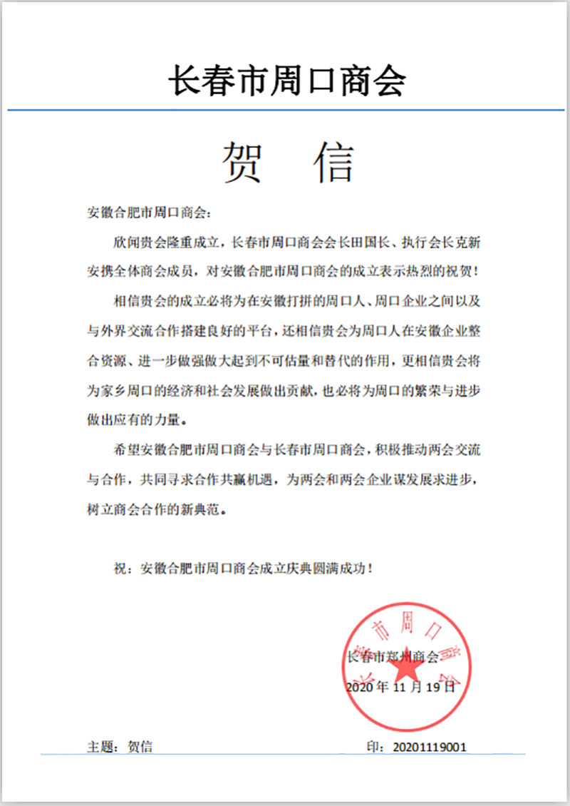 长春市周口商会对合肥市周口商会成立大会的贺信