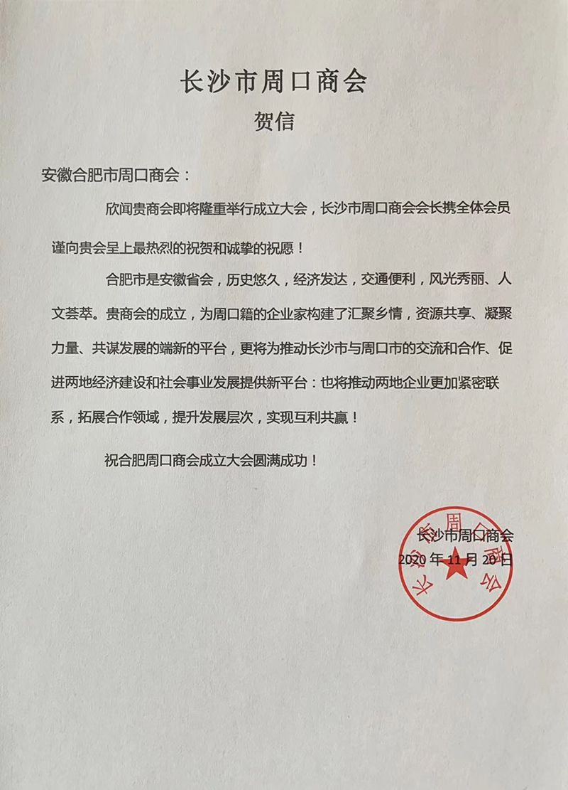 长沙周口商会对合肥市周口商会成立大会的贺信