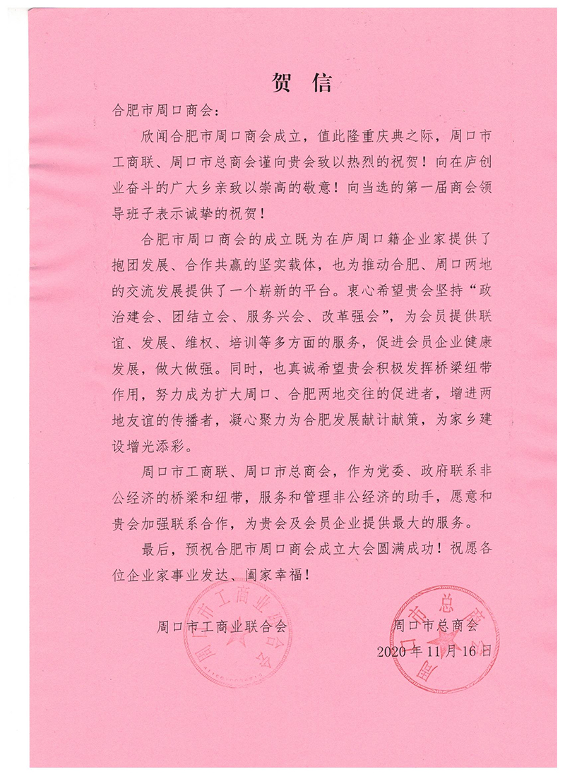 周口市总商会对合肥市周口商会成立大会的贺信