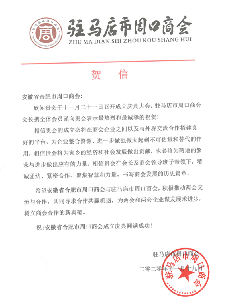 驻马店周口商会对合肥市周口商会成立大会的贺信