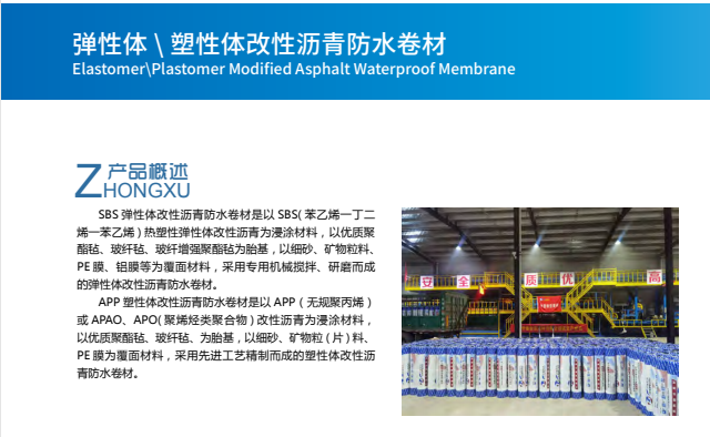 河南中蓄新型建材有限公司坐落于有防水之乡著称的河南项城防水产业园,占地面积近40000 平方米,园区有各类卷材、涂料等防水材料研发生产基地,公司引进全套国内先进的生产设备,具有雄厚的技术力量,现拥有多条现代化的生产线,可生产“SBS”、“APP”、“OMP”改性沥青防水卷材,彩色沥青瓦、屋面用耐根穿刺防水卷材,自粘防水卷材、强力交叉膜自粘防水卷材、非沥青基高分子自粘防水卷材、聚乙烯丙(涤)纶高分子复合防水卷材、聚氯乙烯(PVC)防水卷材、热塑性聚烯烃 (TPO) 防水卷材、聚氨酯防水涂料、JS防水涂料、水泥基渗透结晶型防水涂料、喷涂速凝橡胶沥青防水涂料、非固化橡胶沥青防水涂料、堵漏灵、聚乙烯丙纶专用干粉胶等几十种系列产品。