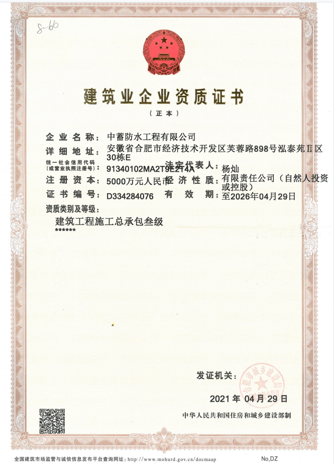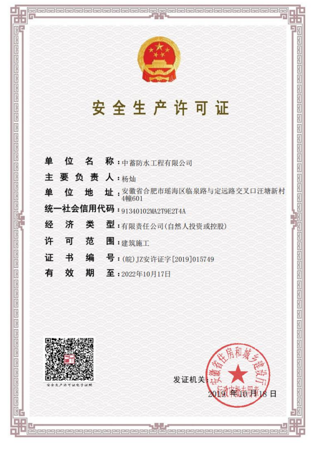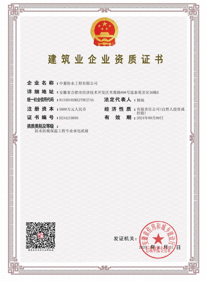 中蓄防水工程有限公司成立于2018 年,企业评级 AAA 级信用企业、安徽省周口商会副会长、安徽省湖南商会副会长、安徽省河南商会理事、北京绿色建筑产业联盟会员等。公司注册资本 5000 万元,具有独立法人资格,拥有建筑业企业防水防腐保温工程专业承包贰级、建筑工程施工总承包乙级、施工劳务资质等三项资质。公司下设工程成本部、财务部、市场部等职能科室。自成立以来,经过全体员工的努力拼搏,公司在人员、业务拓展等领域不断壮大,现有一级建造师、中级职称、高级防水工程师、质量员、安全员、电工等多名相关专业技术人员及稳定的防水劳务队伍。可承担各类工业、民用建设项目防水防腐保温及堵漏修缮工程,并提供所有建筑防水施工、堵漏修缮所需要的各类材料。