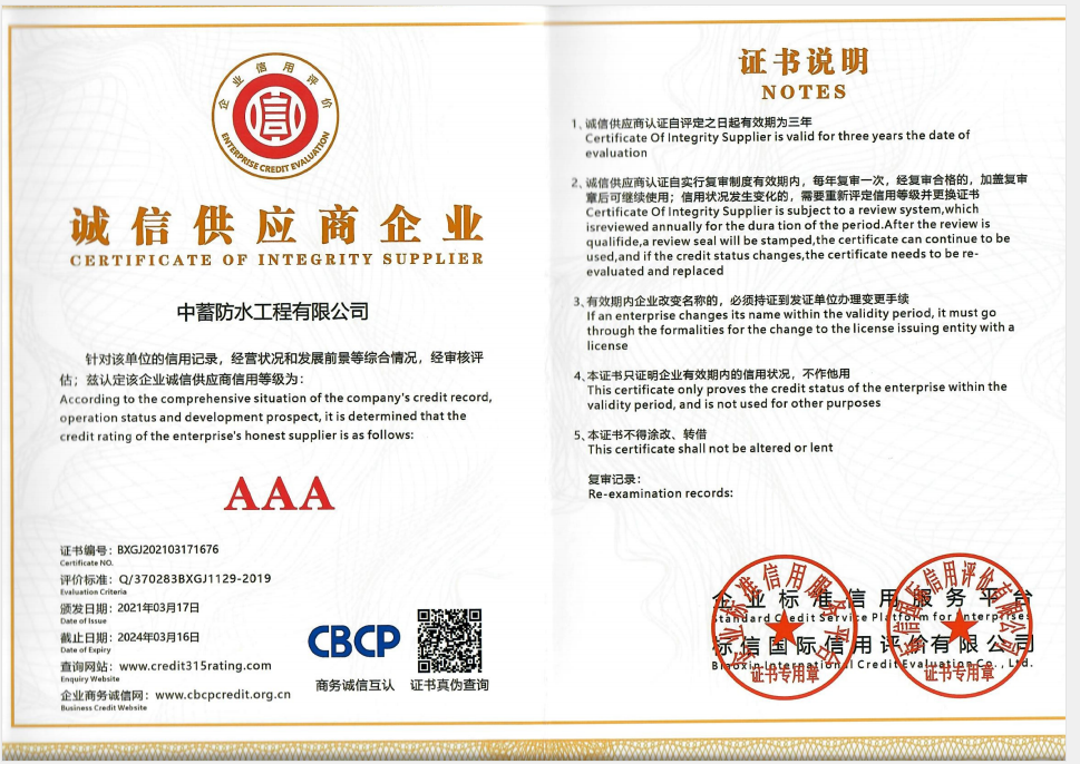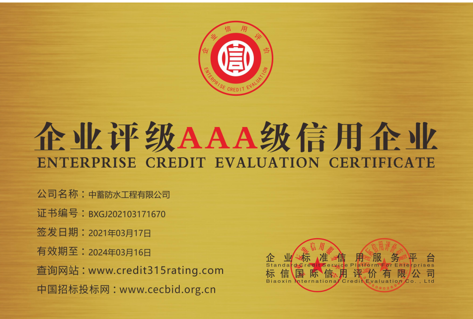 中蓄防水工程有限公司愿与各界朋友精诚合作,为客户提供长久的优质满意服务,始终秉承敬业、精益、专注、创新的企业精神,坚持以诚信为原则、靠质量求生存、树品牌求发展的经营理念,推动防水保温事业稳步向前!