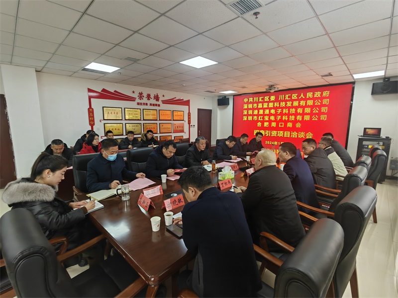 2024年1月16日上午,周口市川汇区招商引资项目洽谈会在川汇区科技企业孵化园召开。川汇区委书记刘德君,川汇区政协主席王卫东,川汇区统战部长张兴龙,川汇区政协副主席、工商联主席马淮海,管委会主任侯明亮,以及商务局、高新区领导等出席会议。深圳市嘉蓝图科技发展有限公司董事长余俊峰,深圳迪晟通电子科技有限公司总经理张小玲,副总经理熊夔英,深圳市红宝电子科技有限公司董事长方晓敏,合肥市周口商会会长丁红伟等企业家代表参加会议。