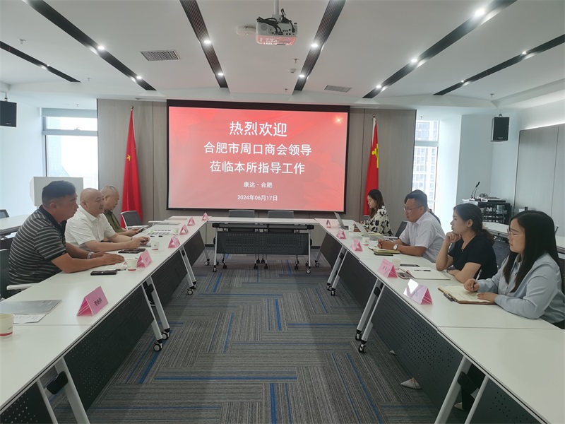为深化会员企业法律服务工作,促进会员企业健康发展,2024年6月17日下午,合肥市周口商会会长丁红伟,执行会长吕琪瑞,副会长潘布广,理事李现成,秘书长郑德林一行前往新入理事单位---北京康达(合肥)律师事务所开展走访交流活动。律所高级合伙人、合肥市周口商会理事马文杨,律所高级合伙人梁昕,专职律师何小颖、程佳慧、桑成凯参加座谈。